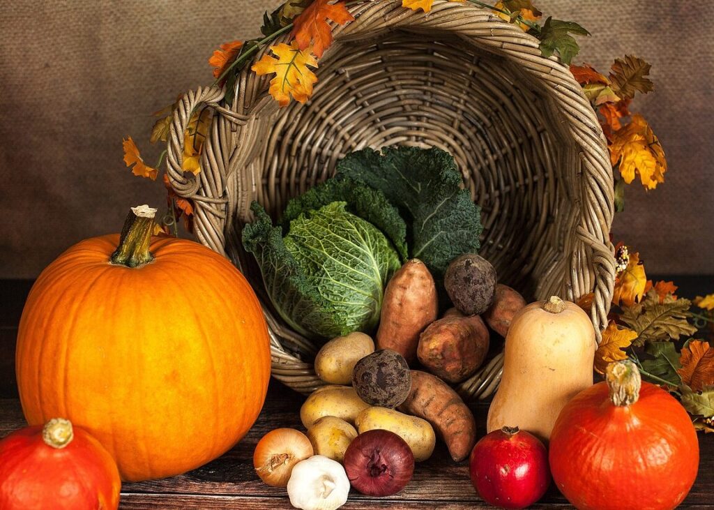 - Crops in abundance: 大量の作物が収穫された状況を描写します。
