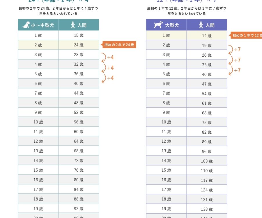 一般的に、英語では犬の年齢を人間の年齢に換算するために「犬の1歳は人間の7歳相当」とされることが多いですが、実際にはこの換算式はすべての場合に当てはまるわけではありません。特に、大型犬と小型犬では成長速度や寿命が異なるため、この単純な計算だけでは不十分です。以下に一般的な目安をご紹介します。