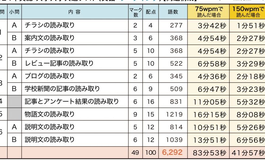 | リーディング | 多様な文章スタイルから情報抽出能力評価(約50問) |