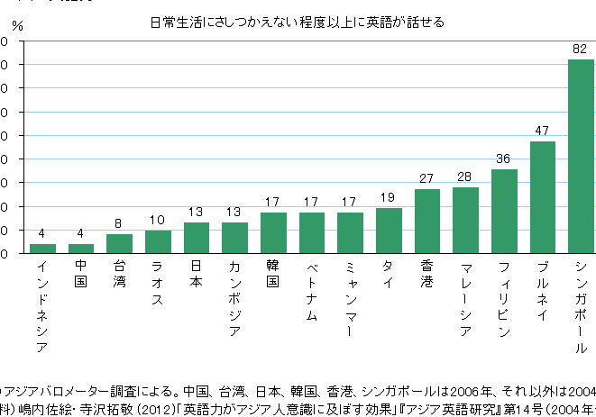 私たちは、ことに興味を持っています。英語はグローバルなコミュニケーションツールとしてますます重要になっており、特に東洋諸国におけるその普及状況について理解を深める必要があります。どれほどの割合の人々が日常会話やビジネスで英語を使用しているのでしょうか。