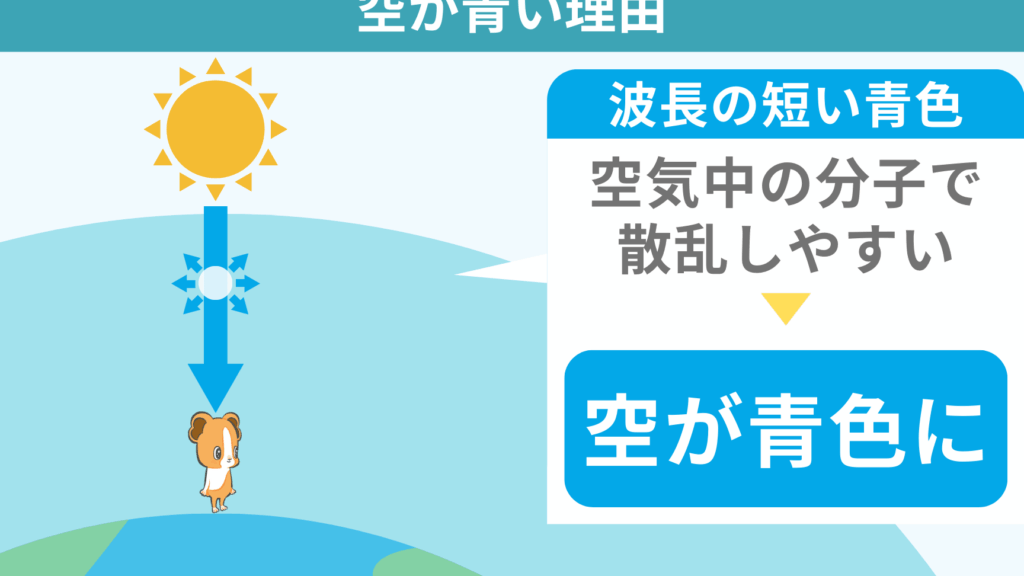 - 短波長: 青い光(約450ナノメートル)が最も強く散乱される。