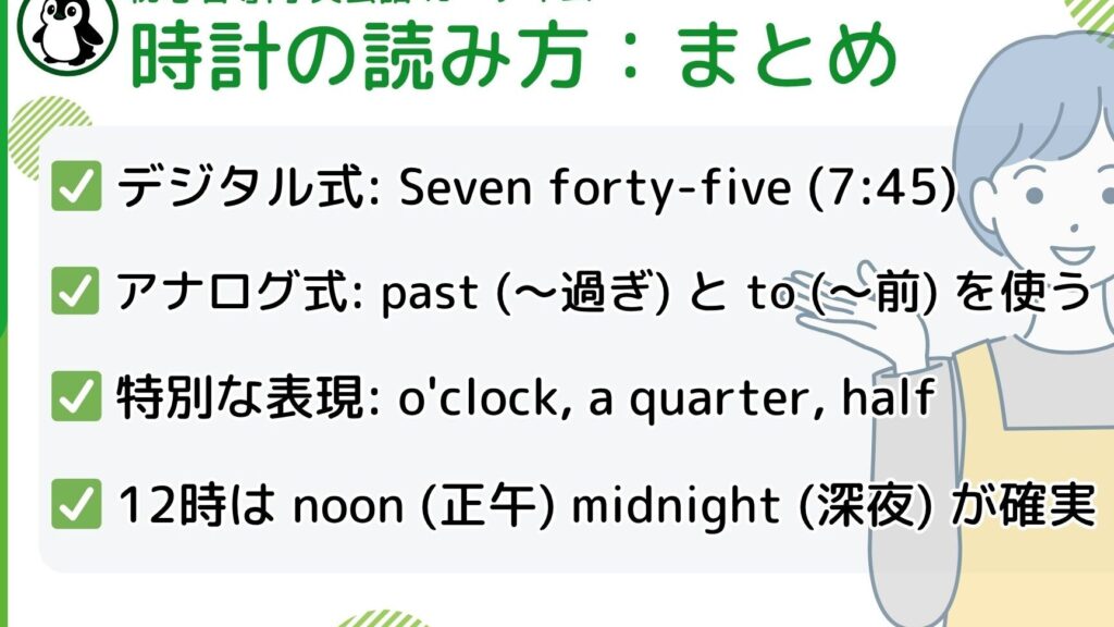 これらの簡単なフレーズさえ覚えておけば、「何日の何時に 英語」を使った会話でも自信が持てるでしょう。また、自分自身が情報提供者となる場合にも非常に便利です。正確な時間表示や意図した意味が伝わりやすくなるため、積極的に活用してみましょう。