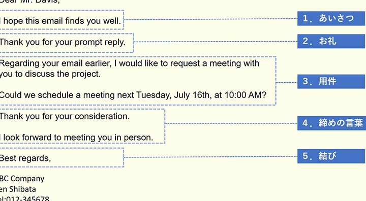 - 言語: 相手企業言語で表現する努力も大切です。