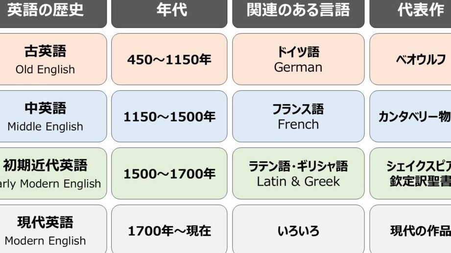 英語が現在の形になるまでには、多くの歴史的出来事が影響を与えました。以下はそのいくつかです: